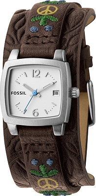 Time Check please! Enter the Analog Silver Dial Watch by Fossil! A very 60s-era pattern is embroidered on this thick leather strap for a bohemian feel. The look is completed with a silver stainless steel watch. It's a great carefree style fit for summer days.